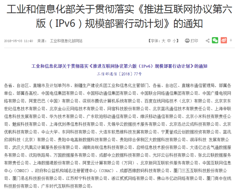 根據中辦、國辦下發的《行動計劃》和工信部下發的《通知》:2018年末,省級政府網站,央企網站和新聞媒體網站全部改造支持IPv6;2020年末,市級政府和新聞媒體和工業互聯網應用支持IPv6。...