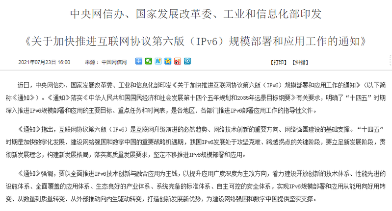 • 中央網信辦、國家發展改革委、工業和信息化部印發 《關于加快推進互聯網協議第六版(IPv6)規模部署和應用工作的通知》