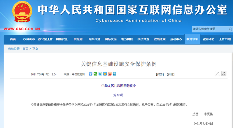 中華人民共和國國務院令第745號《關鍵信息基礎設施安全保護條例》已經2021年4月27日國務院第133次常務會議通過,現予公布,自2021年9月1日起施行??偫怼 ±羁藦?021年7月30日關鍵信息基礎設施安全保護條例第一章 總  則第一條 為了保障關鍵信息基礎設施安全,維護網絡安全,根據《中華人民共和國網絡安全法》,制定本條例。第二條 本條例所稱關鍵信息基礎設施,是指公共通信和信息服務、能源、交...